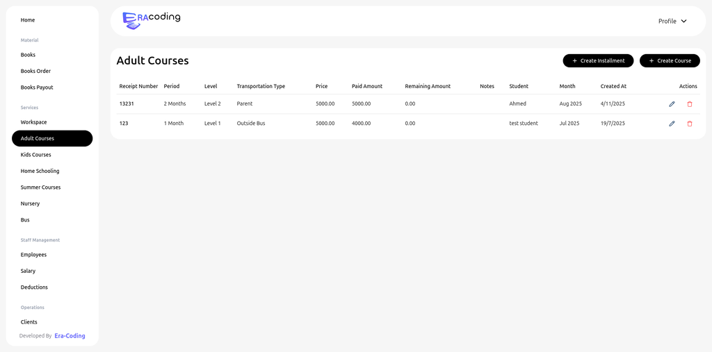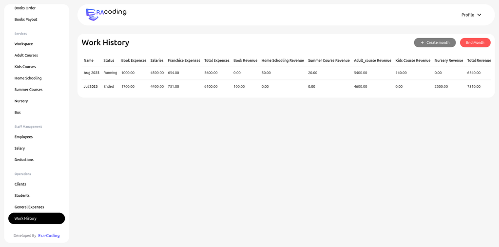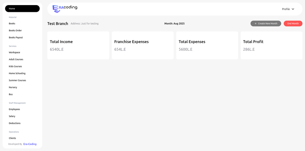 Manager can manage students and clients, and can add expenses in the current month to calculate total net profit (appearing in homepage)